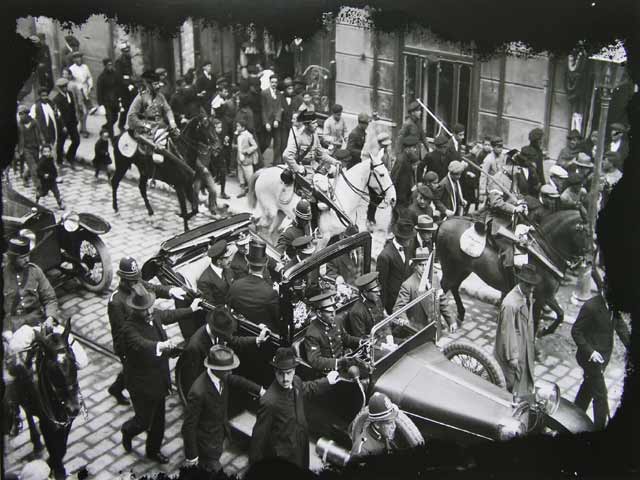 Alrededor de las 21.00 horas de la noche del 14 de abril Alfonso XIII abandonó el Palacio Real por la puerta secreta que daba a los jardines del Campo del Moro. El rey marchó delante en su coche de alta gama, un Duesemberg convertible. Le acompañan, en el automóvil, el infante Alfonso de Orleans y su ayudante Moreu. El ministro José Rivera y el duque de Miranda irían detrás. Más tarde descubrirían que también les acompaña un coche patrulla de la Guardia Civil. En la calle, la República ya era festejada y la bandera roja presidía el edificio de Correos.